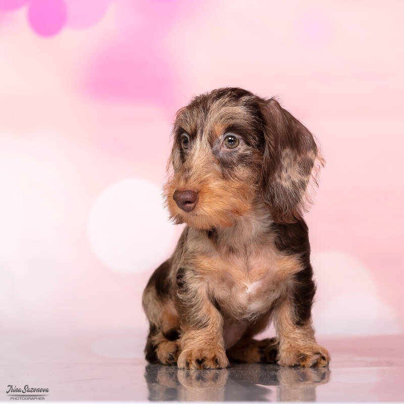 Sie stammt aus Russland und ist eine Zwergrauhaardackel-Hündin in der Farbvariante Merle, auch als Tigerfarbe bezeichnet. Bereits jetzt überzeugt sie durch ihre Ausstrahlung, ihre Aufmerksamkeit und ihr ausgeglichenes Wesen.
